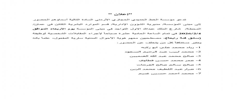 تدعو مؤسسة الخط الحديدي الحجازي الأردني السادة التالية أسماؤهم الحضور إلى مبنى المؤسسة/ مديرية الشؤون الإدارية/ قسم الموارد البشرية الكائن في عمان/ المحطة/ شارع الملك عبدالله الاول التواجد في مبنى المؤسسة يوم الأربعاء الموافق 4/2/2026 في تمام الساعة الحادية عشرة صباحاً لإجراء المقابلات الشخصية لوظيفة (سائق فئة رابعة)، مصطحبين معهم هوية الأحوال المدنية سارية المفعول، علماً بأنه يعتبر مستنكفاً كل من يتخلف عن الحضور: